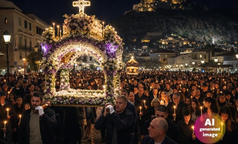 Με αυξημένη συμμετοχή πιστών και σε κατανυκτική ατμόσφαιρα πραγματοποιήθηκε η περιφορά των Επιταφίων στο Άργος τη Μεγάλη Παρασκευή, με επίκεντρο τη συνάντηση των ενοριών στην πλατεία Δημοκρατίας.